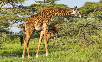 Giraffes prefer to eat leaves from the top portion of the trees, and acacias are their favorite ones.
