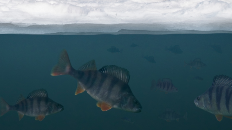 While layers of ice form on the surface of the water, the warmer water sinks to the bottom. Here it remains 4° C warm because the ice on the surface protects the water from further cooling. This is perfect for the fish to survive the winter.