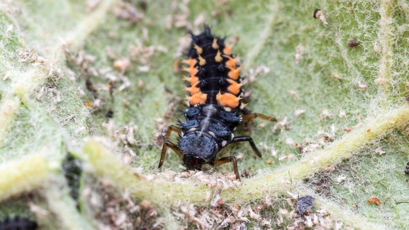 The larvae hatch from the eggs. They first eat the egg shells. They then spend most of their lives eating aphids. A single larva can eat up to 70 aphids a day, which has earned it the nickname "aphid lion".