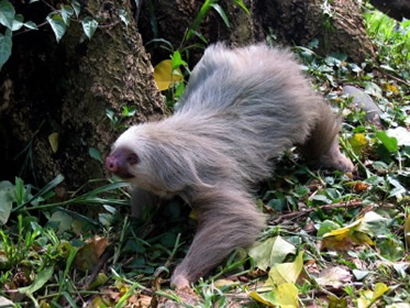 It takes the sloth a full hour to climb down a tree and back up. Once on the ground, he has to struggle to move along and pulls himself forward using his claws. This is why he prefers to stay on the same tree for an entire week.