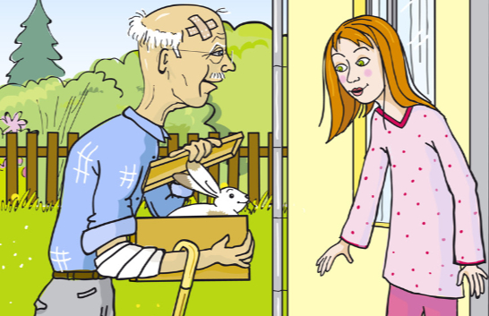 The man tells how he has discovered the rabbit last night on the road. He could just save Carrots from a car - and has hurt himself, because he stumbled and fell.