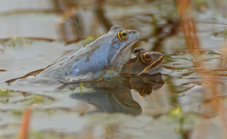 If you pass through a water-rich flat landscape in Europe at the end of March or beginning of April, you have the chance to observe a unique miracle: in some areas, the brown male moor frogs turn blue during the spawning season.